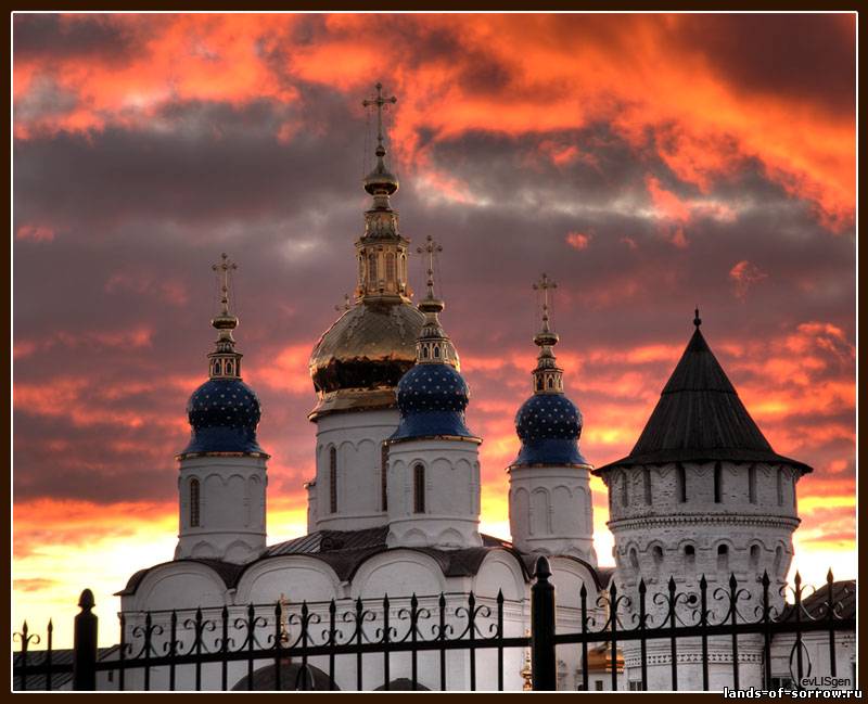 Западное крыло состоит из здания судебной управы, дворца наместника и его хозяйственных построек,а над всем кремлем возвышается колокольня высотой 75 метров. Я советую подняться на самый верх и посмотреть на город свысока. Должен сказать, правда, что это небезопасно. Первые две колокольни, которые предшествовали нынешней, рухнули... Впрочем эта стоит уже более 200 лет с 1794 года, а в свое время она несла 15 колоколов, один из которых весил более 1000 пудов. С колокольни можно увидеть не только весь город но и место впадения Тобола в Иртыш.