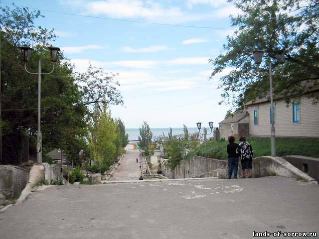 дорога на пляж. их было две - одна простой горкой, где можно было проехать на машине - вторая лестницей. мы обычно спускались по одной, а поднимались по другой.... а когда шли на пляж, в конце "горки" покупали семечки, там все время продавали их и в основном одни и те же бабаульки, с ними даже здоровались как со знакомыми и семечки были очень вкусно пожарены! ф 21